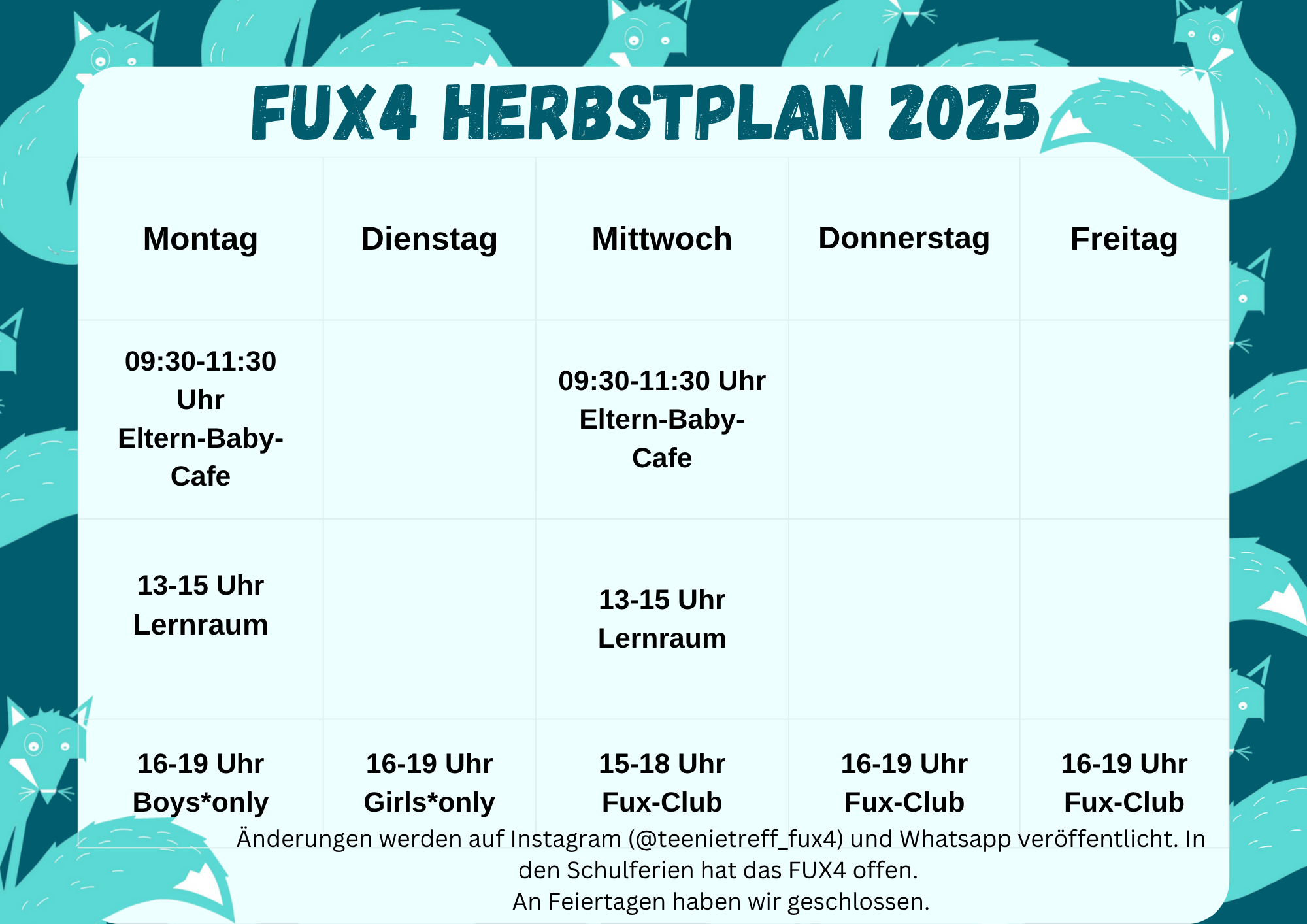 Alle Angebote finden im FUX4 (Favoritenstraße 38, 1040 Wien) statt, sind kostenlos und du kannst ohne Anmeldung vorbeischauen.
